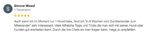 Sehr gut fand ich die wöchentlich 1-2x stattfindenden Liverunden auf Facebook mit der Möglichkeit Fragen zu stellen bzw. einige Sachverhalte zu diskutieren. Auch wenn ich nicht an allen Liverunden teilnehmen konnte, ist es eine super Idee, diese „Sitzungen“ später online zu stellen. So hat man die Möglichkeit, im Nachhinein noch Anregungen und Hinweise zu erhalten. Da ich beruflich zeitlich sehr eingespannt bin und flexible Arbeitszeiten habe, ist es mir nur schwer möglich, an einem bestimmten Tag zu einem festgelegten Zeitpunkt zum Hundetraining auf dem Platz zu erscheinen. Deshalb ist diese Art und Weise des Hunde-Besitzer-Coachings die perfekte Lösung für mich. Ich kann mir den für mich passenden Hundetrainer im Web suchen und mir meine Lern- und Trainingszeit selbst einteilen. Ich würde sagen: alle Daumen nach oben und volle Punktzahl!
