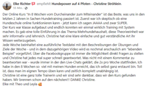 Die schriftlichen Unterlagen sind sehr ausführlich und verständlich; die Trainingsfilme dazu sind toll und nachvollziehbar aufbereitet. An dem nächsten Online-Kurs werden wir wieder teilnehmen. Christine ist in jeder Hinsicht die beste Mensch-Hund-Trainerin, die wir uns vorstellen können. Vielen lieben Dank für deine Unterstützung!