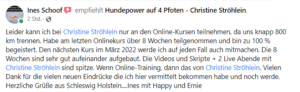 Bei Christine habe ich endlich gelernt, wie ich meinen Hunden erkläre, was ich von ihnen möchte. Zu jedem Thema gibt es genaue Anleitungen, Videos und Übungen die uns viel Spaß machen. In den 2x wöchentlich stattfindenden Online Treffen wurden immer alle offenen Fragen von Christine beantwortet. Die Atmosphäre in dem Kurs war entspannt, freundlich und lustig, genau wie Christines Umgang mit Hunden.